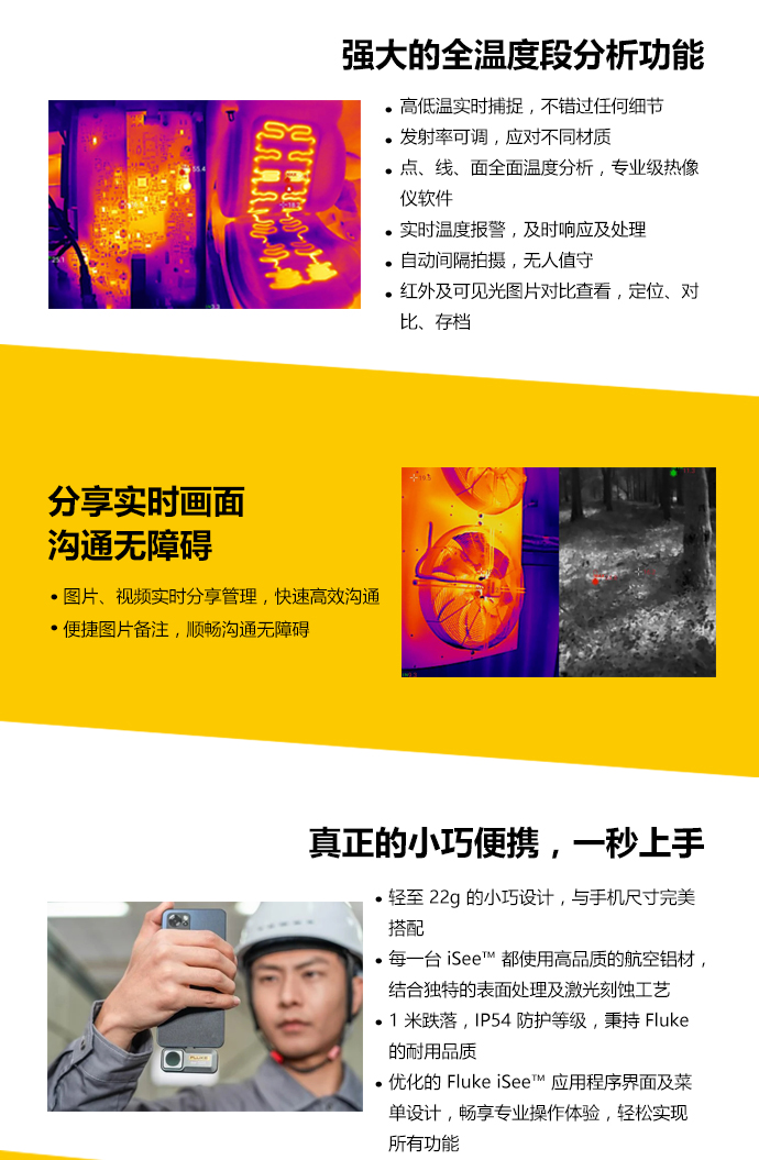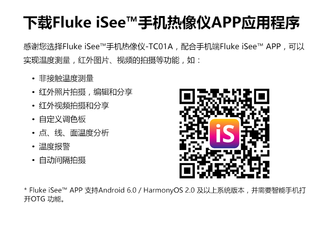 Fluke iSee?手機熱像儀-TC01A,配合手機端Fluke iSee? APP,可以實現溫度測量,紅外圖片、視頻的拍攝等功能