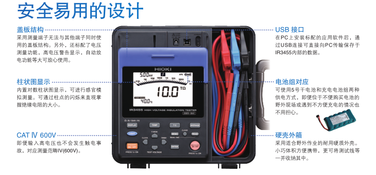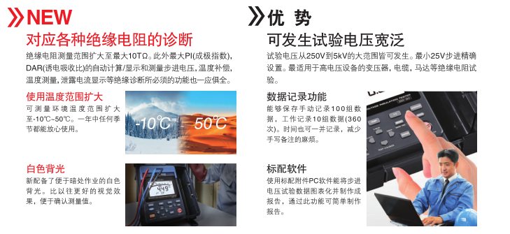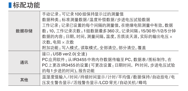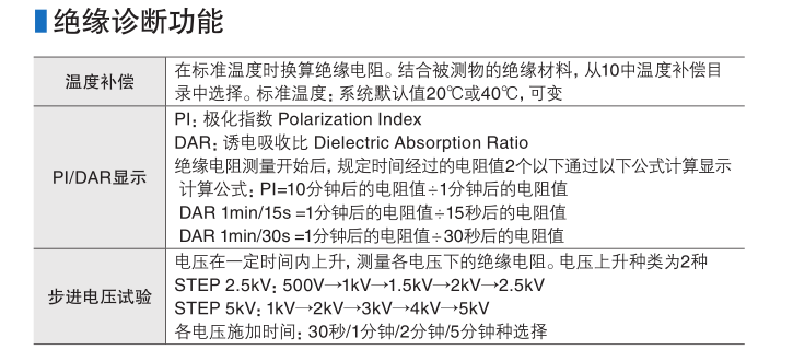 ? 適用于高電壓設備(變壓器、馬達、電纜等)的絕緣電阻.? 使用PI值(極化指數)和DAR值(感應吸收比)功能來檢查絕緣質量.