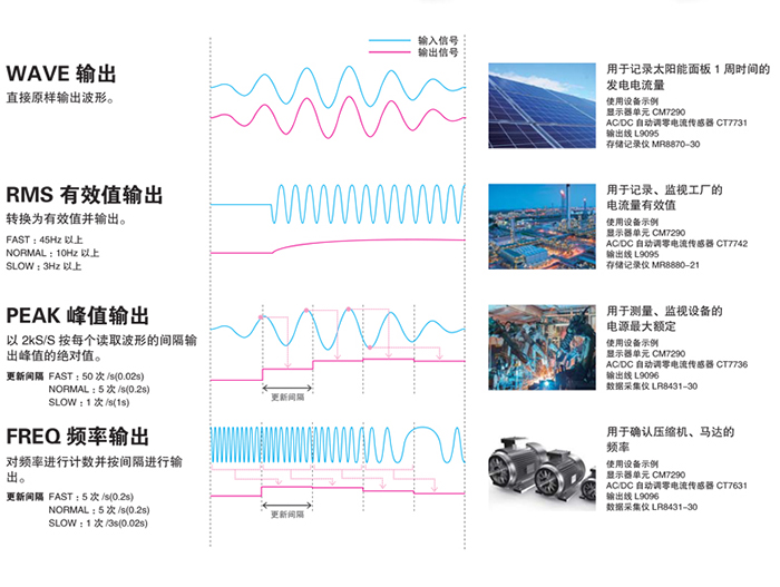 ● 可向數據采集儀和存儲記錄儀進行4種格式的輸出(波形、有效值、峰值、頻率)