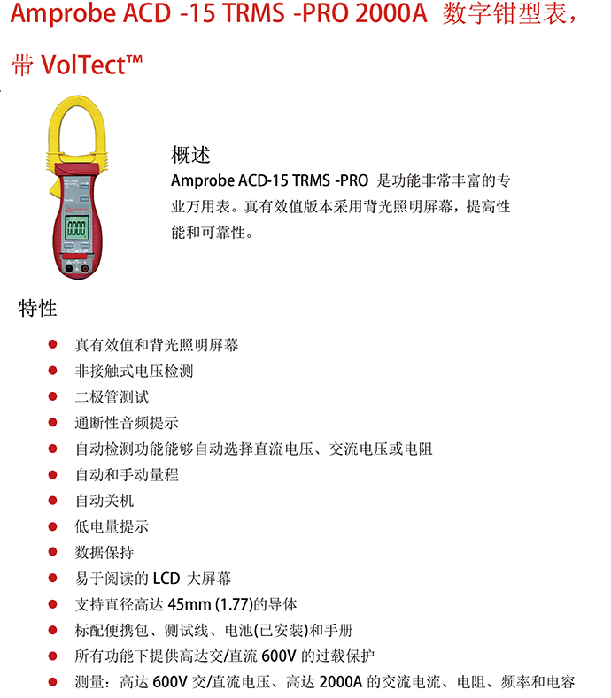 Amprobe ACD-15 TRMS-PRO是功能非常豐富的專業萬用表。真有效值版本采用背光照明屏幕,提高性能和可靠性。