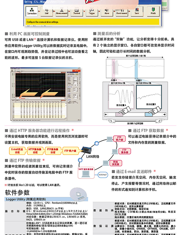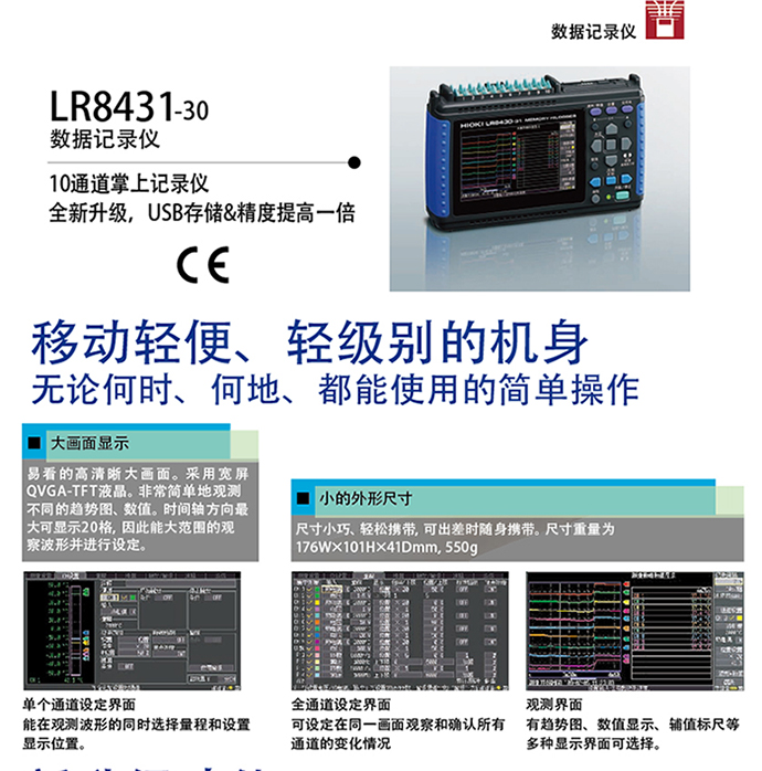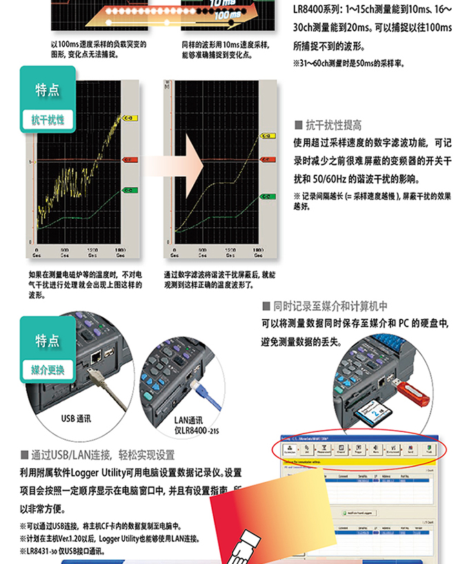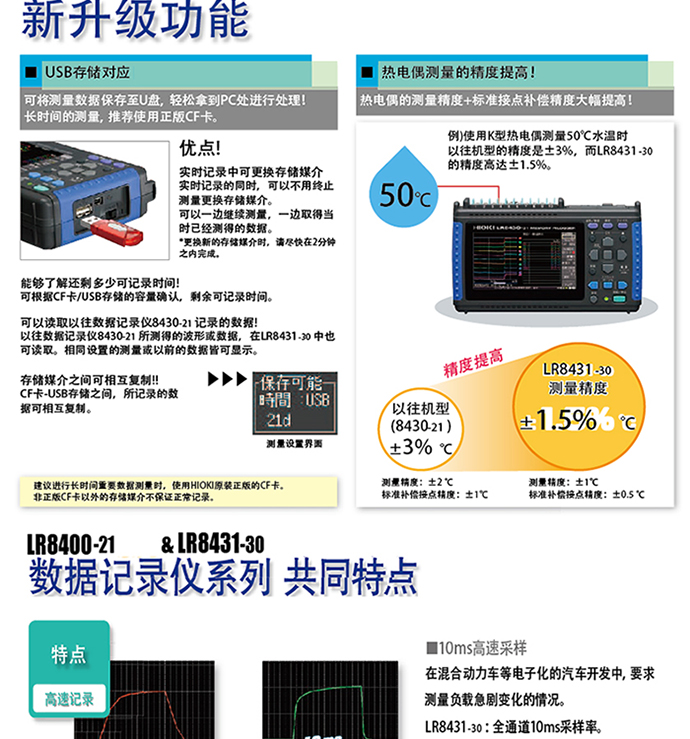 LR8431-30是之前發售10ch數據記錄儀8430-21的升級產品。在原來機型的基礎上大大改善2點。第一、 現在能夠使用U盤,第二、提高了熱電偶測量的精度。由此提升了用戶的操作便利性。